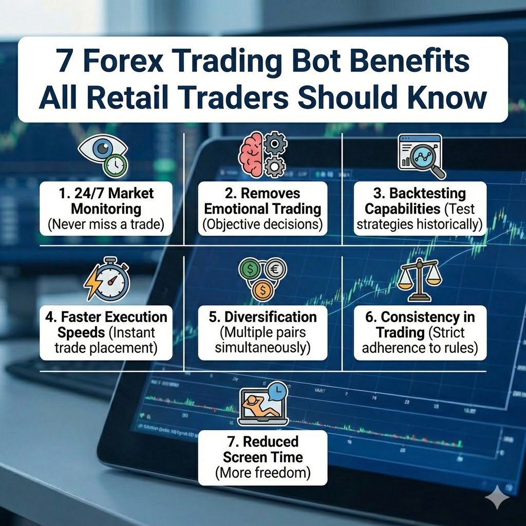 Discover 7 key forex trading bot benefits for MT4 and MT5 users. Learn how automated bots can improve your trading strategy and results today.